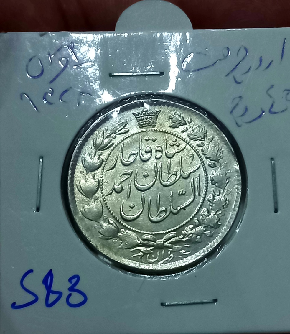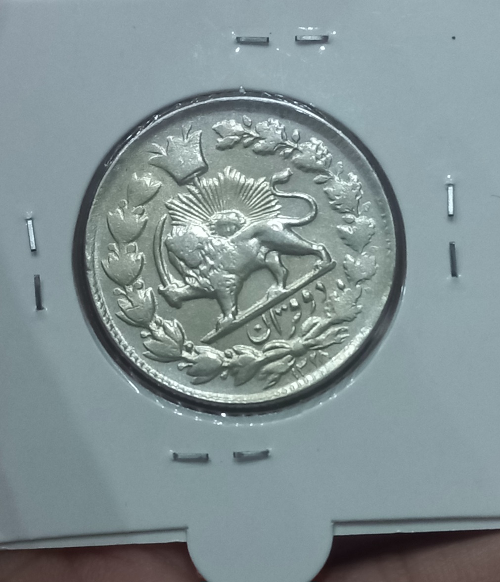 دو قران نقره سال1328ه. ق احمدشاه قاجار با ارور چرخش45درجه